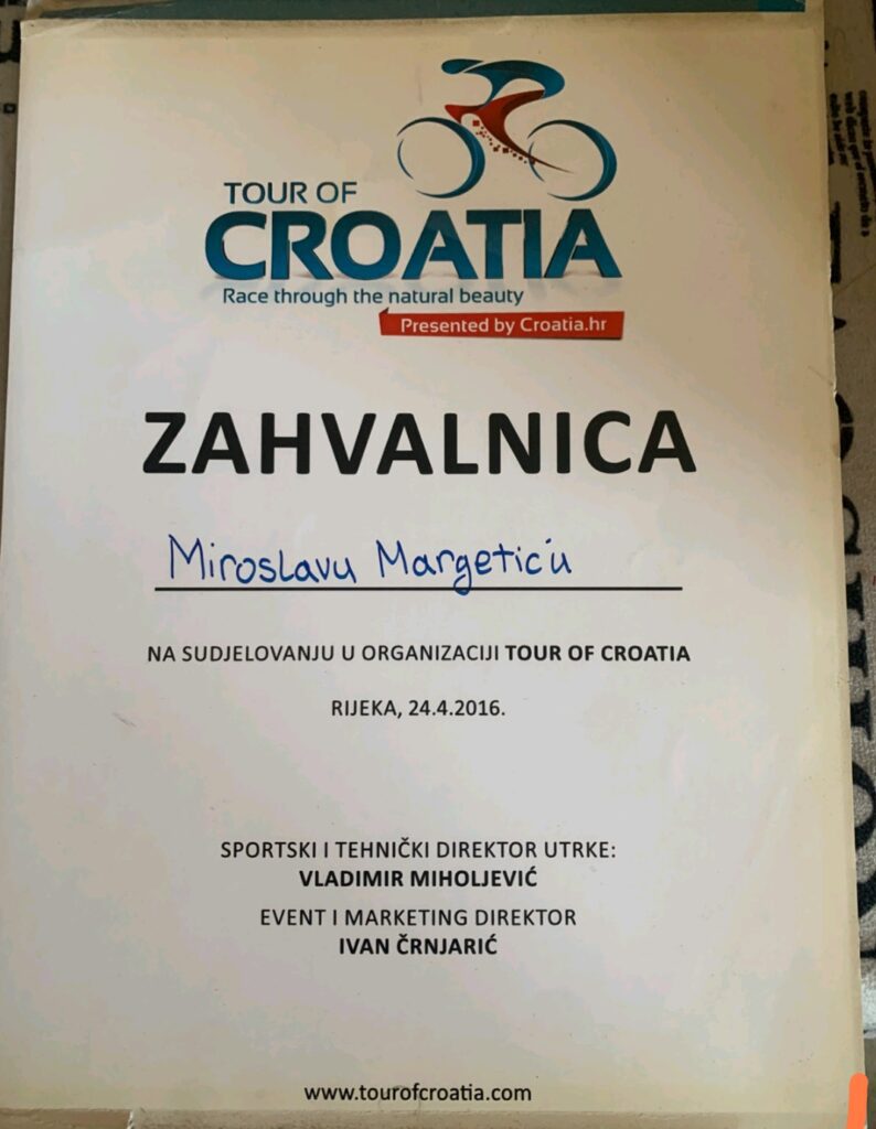“Tek prije 4 godine, jer neću da spominjem opstrukcije i neke stvari, koje su se dešavale, izmedju toga, ponovo polažem za biciklističkog komesara. To je treći stepen od ukupno četiri stepena u biciklističkoj organizaciji. Sudio sam više medjunarodnih utrka, a takodje učestvovao u organizaciji Tour de Croatia, jednog od značajnijih biciklističkih događaja.