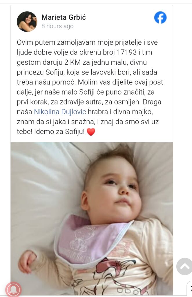 Sofija Dujlović iz Banjaluke ima samo 15 mjeseci, a njena borba traje gotovo cijeli njen život. Pozivom na broj 17193 ljudi dobrog srca mogu donirati 2 KM za liječenje i oporavak ove djevojčice.