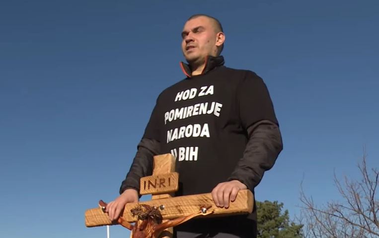 Josip na svojim leđima nosi Krst, zastavu Bosne i Hercegovine, i majicu na kojoj piše: “Hod za pomirenje naroda u BiH!