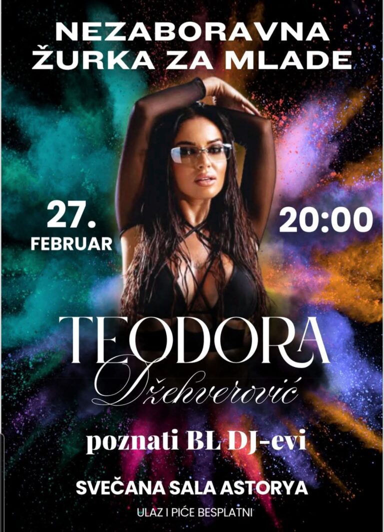 Na FB grupama osvanuo je plakat na kojem se pozivaju mladi na besplatnu žurku, na kojoj nastupa Teodora Džehverović i DJ-evi.