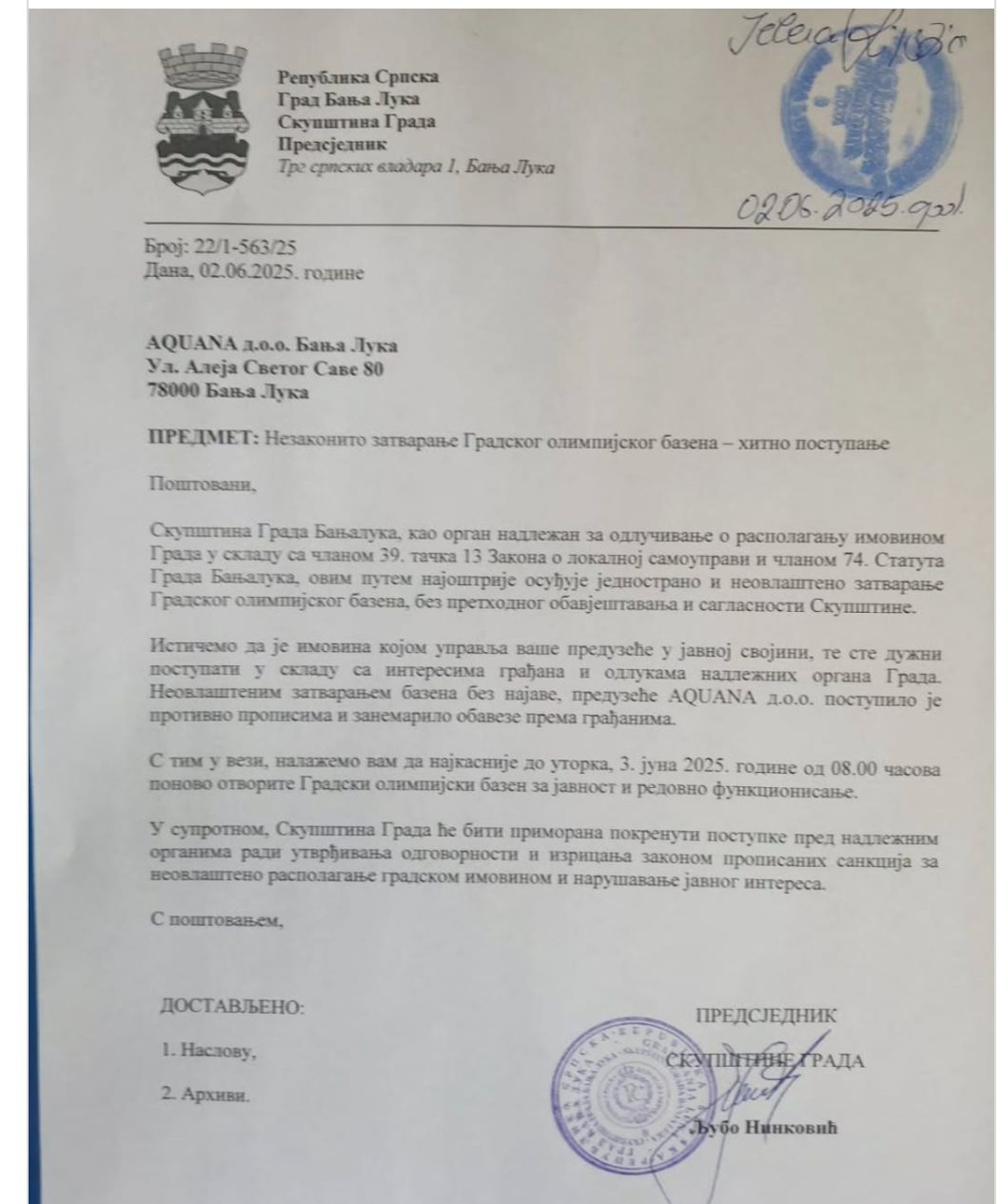 Kako je navedeno u dopisu dostavljenom na adresu Javnog preduzeća “Aquana”, a koji je potpisao Ninković, ukoliko se bazen ne otvori uslijediće sankcije.