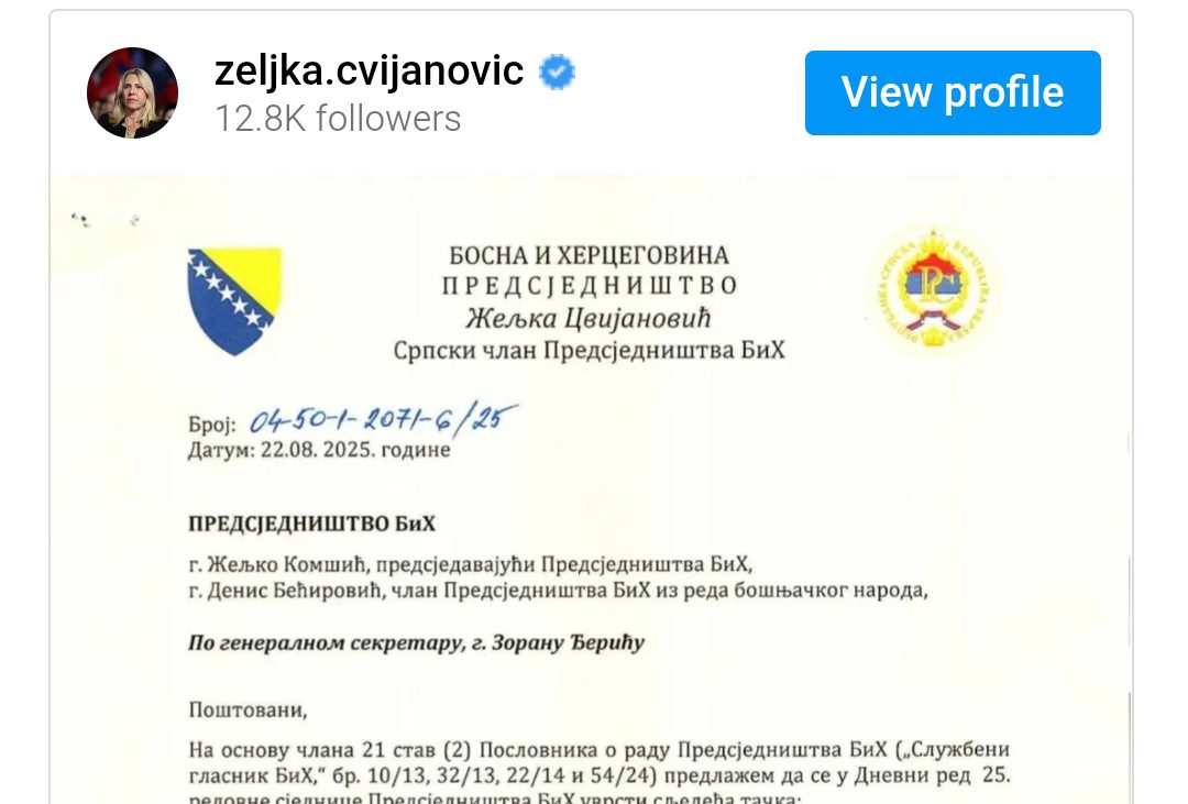 “Cijeneći njegove napore i dostignuća u oblasti mira, smatram opravdanim i zasluženim da Predsjedništvo BiH donese odluku da Nj.E. predsjednika Donalda J. Trampa, predloži za Nobelovu nagradu za mir”, navedeno je u inicijativi srpskog člana Predsjedništva.